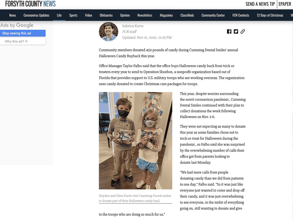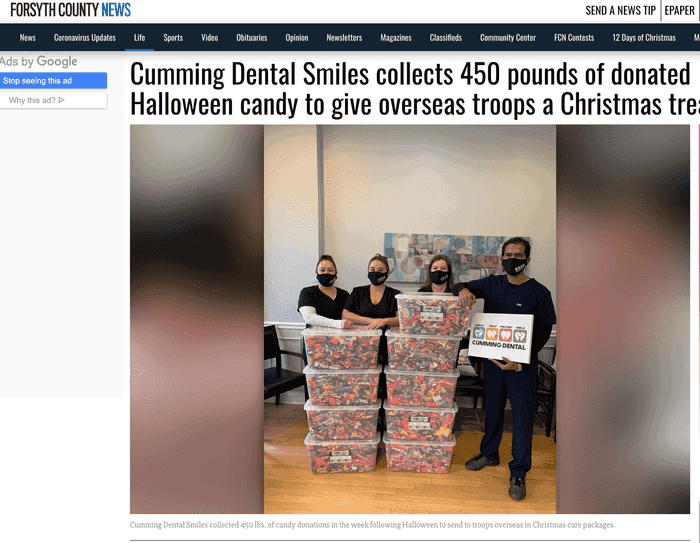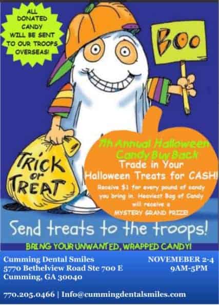 Please drop of your unwanted and wrapped candy at Cumming Dental Smiles AT 5770 Bethelview Road, Suite 700 E, Cumming Ga 30040.